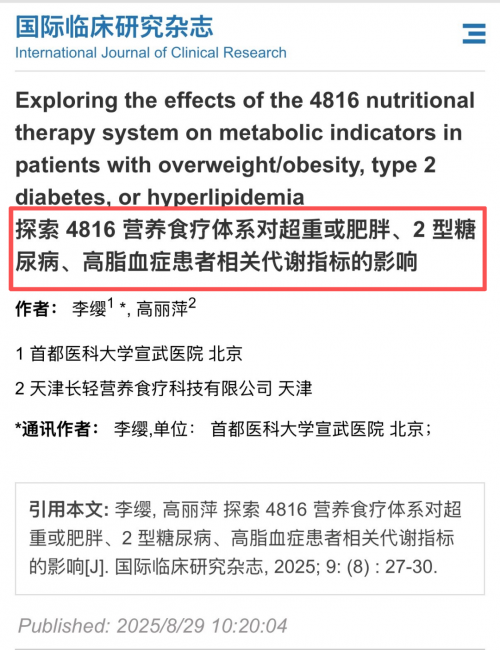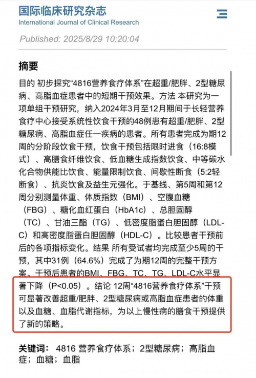 近日,一項(xiàng)發(fā)表于《國際臨床研究雜志》的研究,為營養(yǎng)干預(yù)在慢性病管理中的作用提供了新的科學(xué)證據(jù)。該研究探索“4816營養(yǎng)食療體系”對超重或肥胖、2型糖尿病、高脂血癥患者相關(guān)代謝指標(biāo)的影響。