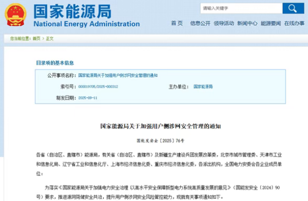 近日,國家能源局綜合司發(fā)布《關于加強用戶側涉網(wǎng)安全管理的通知》(以下簡稱《通知》),從國家層面系統(tǒng)構建了用戶側涉網(wǎng)安全管理的頂層設計和全鏈條管理體系?!锻ㄖ分兄赋鲇脩魝壬婢W(wǎng)安全管理的總體要求,明確各相關主體的權責范圍,推動用戶側涉網(wǎng)安全管理邁入制度化、協(xié)同化和精細化管理。