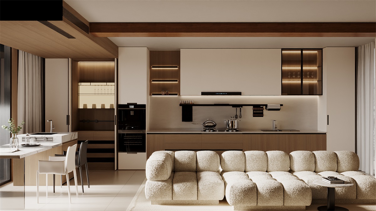 廚房手掃即動的下掛調(diào)味籃、衣柜開門自亮的感應(yīng)燈帶、一鍵啟動的離家模式……精心設(shè)計的全屋定制與裝配式木結(jié)構(gòu)空間相得益彰,讓科技自然融入生活。