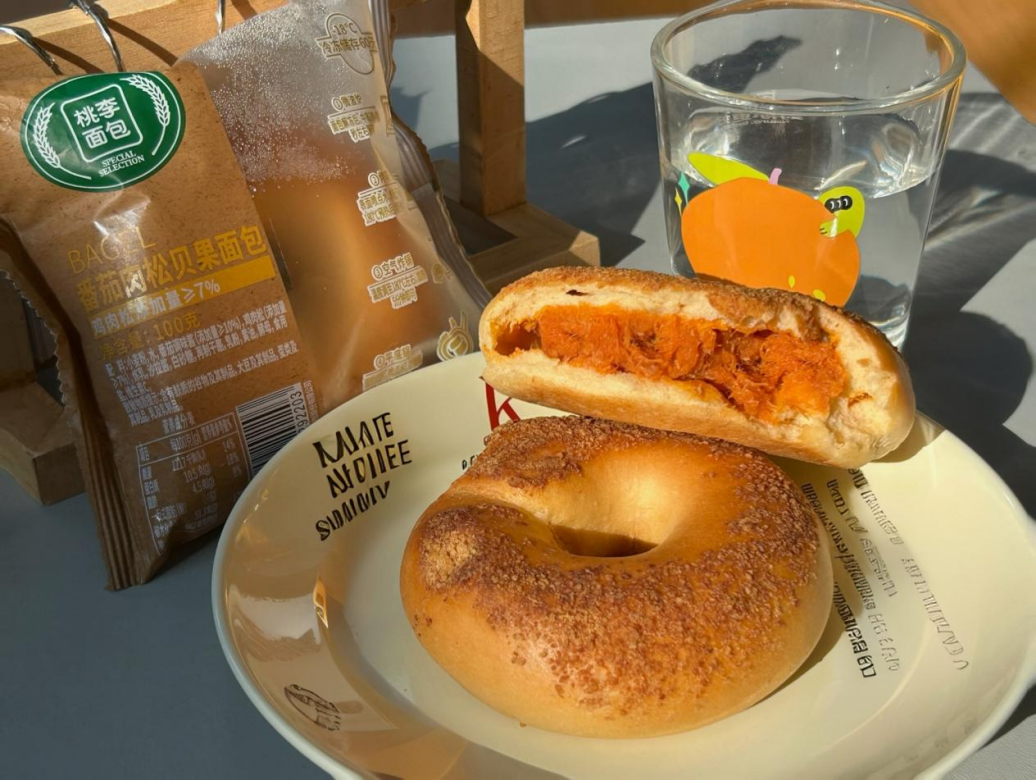 具體到設(shè)計上,桃李面包三款貝果單品各有側(cè)重。土豆泥香腸貝果將土豆泥與熏煮香腸結(jié)合,粉糯彈牙,咸香風(fēng)味適宜作為家庭早餐的主食或親子互動時的加餐,滿足對“豐富口感+家常風(fēng)味”的需求;番茄肉松貝果融合雞肉松與番茄調(diào)味醬,酸甜咸香的復(fù)合風(fēng)味,契合年輕上班族對“便捷與美味”的追求,無論是搭配咖啡的早餐還是補充能量的下午茶,都能帶來味覺驚喜;榴蓮乳酪貝果則以干酪與榴蓮果泥碰撞出香甜濃郁、口感絲滑的體驗,滿足甜品愛好者對“甜蜜體驗+精致口感”的期待,適用于餐后解饞或個人休閑時刻。