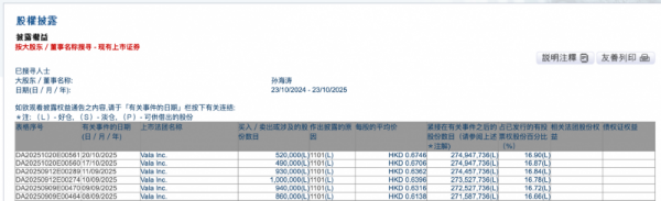 根據(jù)香港聯(lián)交所最新權(quán)益披露資料,VALA(02051.HK)主席、行政總裁兼執(zhí)行董事孫海濤于2025年10月20日在場(chǎng)內(nèi)以每股均價(jià)0.6746港元增持公司52萬股,涉資約35.08萬港元。完成此次增持后,孫海濤持股數(shù)目增至約2.75億股,持股比例由16.87%提升至16.90%。