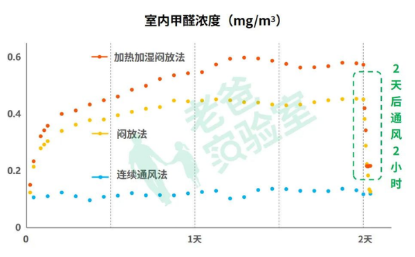 這說(shuō)明在甲醛不斷釋放的情況下,「連續(xù)通風(fēng)法」像流水線一樣,一直在源源不斷地將大量甲醛搬運(yùn)出室內(nèi)。
