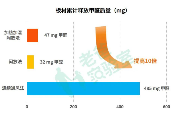這說(shuō)明「悶放法」會(huì)讓板材釋放出來(lái)的甲醛在室內(nèi)累積,隨著時(shí)間的增長(zhǎng),累積得越來(lái)越慢。