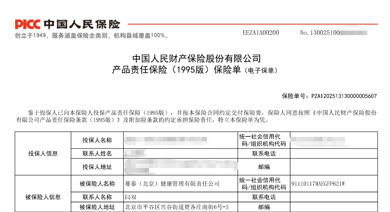 蔓泰(北京)健康管理有限責任公司全線產(chǎn)品承保產(chǎn)品責任險,為消費者保駕護航!